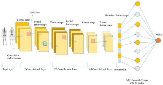 The proposed CNN architecture has an image input size of 256 × 256 pixels, and we pass the images in RGB mode. Three convolutional layers are present, where the max pooling and the dropout layers follow each one of them. It needs to be highlighted that all convolutional layers use ReLU as activation function and the values of filters are doubled for every convolutional layer. This means that the first convolutional layer has 8 filters, the second layer has 16 layers and so on, while all of them have a 3 × 3 pixels kernel size. Furthermore, all pooling layers retain their max values and have 2 × 2 pixels size. In addition, dropout layers have the value 0.7 as their drop rate parameter. Next, the flatten layer follows to convert the data into one dimension; hence, the data are ready for the fully connected layer [90].