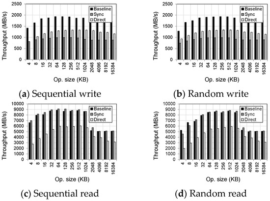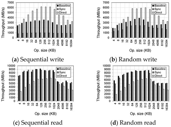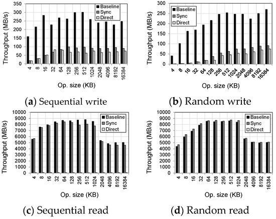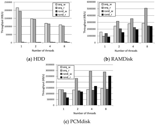 Let us first see the effect of the synchronous I/O mode. As shown in Figure 2a,b, Figure 3a,b, and Figure 4a,b, the write throughput of synchronous I/O is degraded significantly for all cases including HDD, RAMDisk, and PCMdisk. When comparing NVM and HDD, the performance degradation in NVM is relatively minor than HDD. This is because writing to HDD is even slower than writing to NVM. Specifically, the performance degradation of HDD is the largest with small random writes when adopting synchronous I/O.