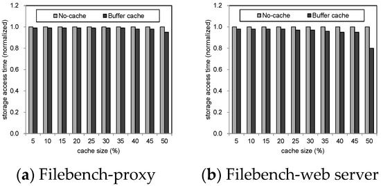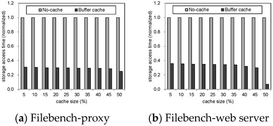 To investigate the efficiency of the buffer cache in more realistic situations, we capture system call traces while executing a couple of representative I/O benchmarks, and perform replay experiments as the storage device changes. Specifically, file request traces were collected while executing two popular Filebench workloads: proxy and web server. Then, we evaluate the total storage access time with and without buffer cache for the given workloads. In this experiment, the cache replacement policy is set to LRU (Least Recently Used), which is most commonly used in buffer cache systems. Note that LRU removes the cached item whose access time is the oldest among all items in the buffer cache when free cache space is needed.