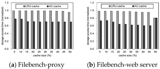 Figure 7 compares the storage access time of two configurations that adopt the same RAMDisk but differentiate the management policy of the buffer cache. Specifically, the LRU-cache inserts all requested file data in the cache and replaces the oldest data when free space is needed. Note that this is the most common configuration of buffer cache, which is also shown in Figure 4. The other configuration, AC-cache, is an admission-controlled buffer cache that allows the admission of file data into the buffer cache only after its second access happens. The rationale of this process is to filter out single-access data, thereby allowing only multiple accessing data to be cached. Although this is a very simple approach, the results in Figure 7 show that AC-cache improves the storage access time by 20–40%. This implies that buffer cache is still effective under fast storage like STT-MRAM, but more judicious management will be necessary to get the maximized performances.