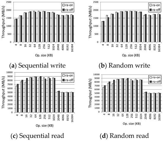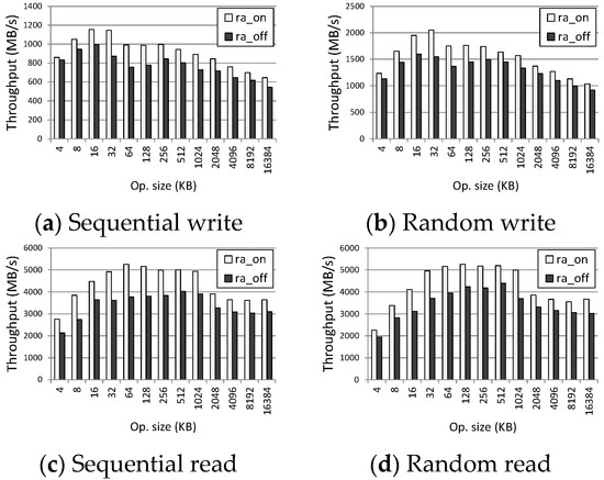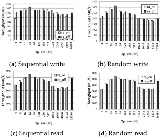 To review the effectiveness of prefetching in NVM storage, we execute the IOzone benchmark under HDD and NVM storage with/without prefetching and measure the throughput. Figure 8, Figure 9 and Figure 10 depict the measured throughput of RAMDisk, HDD, and PCMdisk, respectively, with prefetching (denoted as “ra_on”) and without prefetching (denoted as “ra_off”). As shown in Figure 8, prefetching is effective in read performances when the HDD storage is adopted. However, it does not affect the performance of RAMDisk and PCMdisk as shown in Figure 9 and Figure 10. This implies that prefetching is not effective any longer in RAMDisk or PCMdisk.