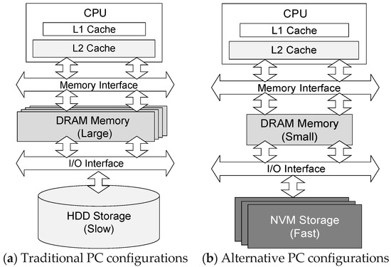 Figure 12. An alternative PC consisting of small DRAM and fast NVM storage in comparison with the traditional PC consisting of large DRAM and slow HDD.