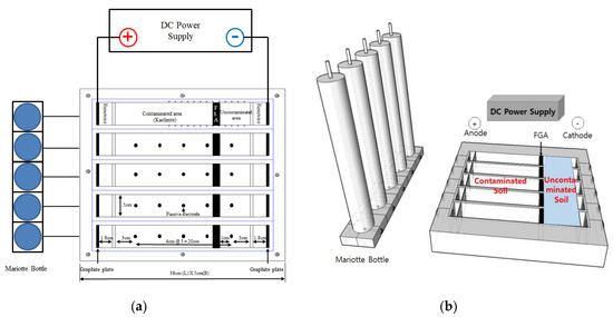 EK remediation consists of installing electrodes and sending a low direct current (DC) current in an area with polluted soil to remove the contaminants (e.g., heavy metals and microorganisms) [16,17,18]. This study applied the more effective removal technique using a Permeable Reactive Barrier (PRB) that prevents the spread of contaminants and purifies them by inducing the adsorption, precipitation and decomposition with the reactant [19,20].