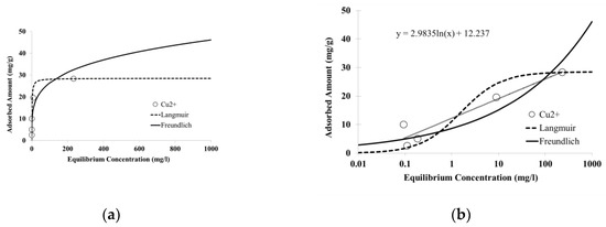 Comparison of the experimental results, with the amount of Copper adsorbed obtained using Langmuir and Freundlich isotherms. (a) General Graph; (b) Log Graph.