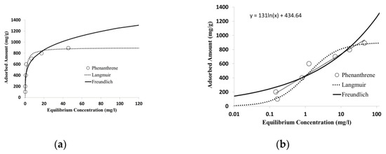 The results of the FSA batch test in the adsorption of copper and phenanthrene are described in Figure 2 and Figure 3. The maximum adsorptions with FSA were approximately 28 mg/g of copper and 890 mg/g of phenanthrene, respectively, indicating the greater adsorption capacity of FSA for phenanthrene, which was approximately 30 times higher than the adsorption of copper. Previous copper adsorption isotherms are described with a semi-log in Figure 2b as well as in Figure 3b. As a result of linearizing the adsorption isotherm models using the Langmuir and Freundlich models in Figure 2a and Figure 3a, the Langmuir model predicted the adsorption of the heavy metals and the organic compounds better than Freundlich model. Similarly, the semi-log scale (e.g., Figure 2b and Figure 3b) also shows a better fit in the Langmuir model.
