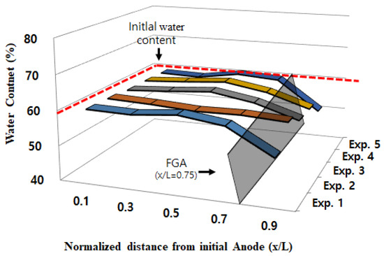 Figure 4 shows the post-experiment water content in the sample, which was determined from five separate ports upon completing the experiment. Each value of the water content in general was not much different from the initial value of 60%; however, it tended to be at a point of x/L = 0.9. Considering that the water content remained similar to that of the initial value, the movement of the improver within the soil was confirmed to be most active during the EK remediation.