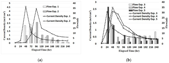 Result of the current density and total flow during the test (Exp. 1–Exp. 5). (a) Exp. 1~Exp. 2; (b) Exp. 3~Exp.5.