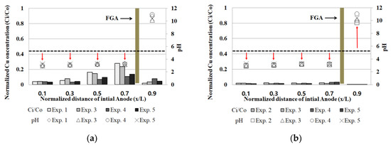 At this point, the concentration of the residual copper was detected as the lowest with the acetic acid improver, implying that the degree of purification in the contaminated ground was greater than that of other cases. In addition, the pH at x/L = 0 − 0.7 was determined to be 2–4, lower than pH 5 where the precipitation of copper occurs, indicating that no precipitation occurred based on the results of a previous study [27]. However, as described in Figure 6b, the characteristics of the removal of phenanthrene were not clearly defined due to the low recovery of the pretreated contaminant sample. Therefore, further study of the pretreatment of phenanthrene might need to be conducted.