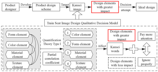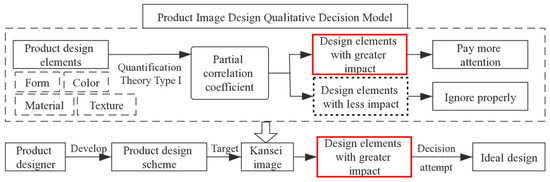 Figure 5, the qualitative decision model of product image design is constructed. Firstly, the product design elements are analyzed, including product form, product color, product material, product texture, product pattern and other design elements. The partial correlation coefficient of product element is obtained through Quantification Theory Type I, and the priority ranking of product design elements affecting Kansei image is obtained.