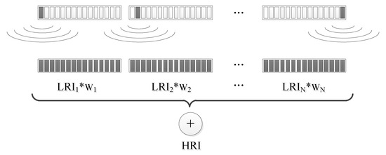 where n and m represent the transmitting and receiving element, respectively. N and M represent the number of elements of the transmitting and receiving array, which are usually equal to total element number of the array, respectively. n = 1, 2, …, N; m = 1, 2, …, M. and are spatial positions of the transmitting element and the receiving element, respectively. is the ultrasonic velocity, is the sampling rate of ultrasonic system. The receiving focused echo image with low lateral resolution (LRI, low-resolution imaging) is given by: