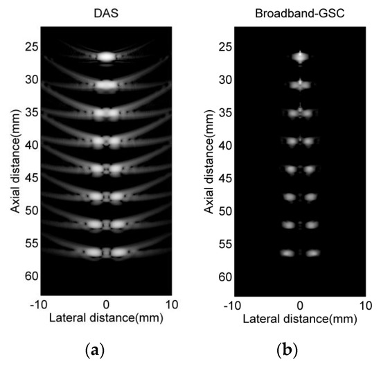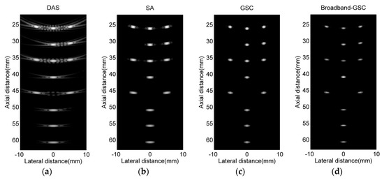 Plane wave emission is one of the most commonly used emission ways in commercial ultrasonic imaging products [29]. Commercial ultrasonic imaging systems need enough emission energy to achieve sufficient system signal-to-noise ratio (SNR). Therefore, the system will obtain better imaging quality with higher investigation depth [30]. Plane wave emission uses all elements to transmit and receive the ultrasonic; the entire imaging region will be covered with one single emission. Therefore, only DAS and Broadband-GSC can be introduced to process the echo signal after the plane wave emission. Beamforming responses of scattering points with plane wave emission are shown in Figure 7.