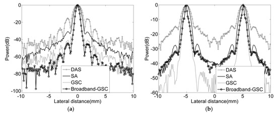 In this section, several examples are provided to compare performance of the proposed beamforming with DAS, SA, and GSC in terms of lateral resolution, sidelobe level and contrast. A simulation tool named Field II is used to calculate the simulated ultrasonic echo data, which is highly accepted in the medical ultrasonic imaging field [22,23]. Simulated echo data can be used to verify the beamforming performance of the algorithm. Field II is used to obtain the simulated echo signal of scattering points and the circular cyst of a linear phased array ultrasonic system. Key parameters of the simulated linear phased array ultrasonic system are listed here: width of array ; center frequency of the ultrasonic ; array number ; ultrasonic velocity ; sampling rate of system .