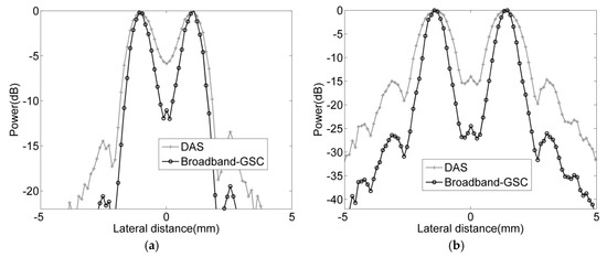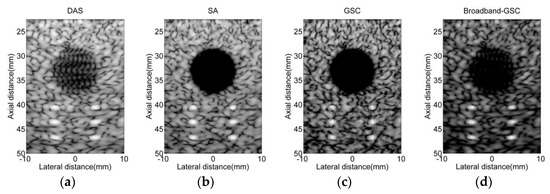 The beamforming responses in Figure 3 are the key to understand the advantages of Broadband-GSC. Compared with traditional non-adaptive beamforming DAS and SA, Broadband-GSC will significantly improve the lateral resolution and restrain the interference and noise signal. Broadband-GSC only uses the receiving focused echo signal after DAS, which achieves an increase in lateral resolution with only one single emission. Compared with GSC, Broadband-GSC not only reduces the beamforming process complexity, but also reduces the system hardware complexity. Consequently, Broadband-GSC beamforming allows for high frame-rate imaging with increased imaging quality. The experiment of circular cyst shows that Broadband-GSC still can improve the lateral resolution and PSL even during the high speckle noise environment. Meanwhile, beamforming algorithms cannot improve the axial resolution. The axial resolution of the ultrasonic imaging system is determined by the center frequency of the ultrasonic , ultrasonic velocity , and the emitted ultrasonic numbers. The axial resolution of system can be improved by algorithm like coded excitation.