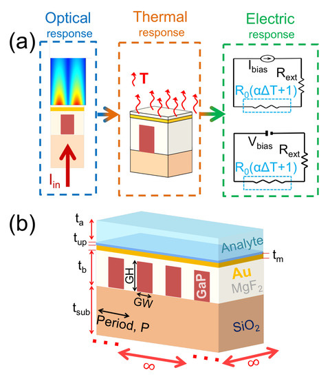 In this contribution, we model and simulate an alternative measurement technique that exploits the bolometer effect, which is triggered by the absorption of the electromagnetic radiation [22,23]. This way, we avoid costly spectral measurement systems because the output signal is electrical by definition [24]. In fact, the bolometric effect is responsible for the variation in resistivity caused by a change in temperature. This mechanism has been widely used in antenna-coupled detectors in the infrared [22,23,25,26]. In a nutshell, our device works under normal incidence conditions and a spectrometer is unnecessary because we measure an electrical signal directly related with the sensed property. A monochromatic laser source eases integration with off-the-shelf driving and signal acquisition electronics, both for illumination and signal retrieval. Our sensor is based on a dielectric grating that couples radiations into a dielectric/metal interface where the SPR are excited. The shape of the resonance is described best as a hybrid-Fano resonance between the pure SPR and a wider response generated by the grating [4]. The resonance strongly depends on the index of refraction of the analyte, which is in contact with the metal layer. At the resonant wavelength, the metal absorbs most of the incident radiation and works almost as a perfect absorber. This absorption increases the temperature in the metal layer, that consequently changes its electric resistance through the bolometric effect. This mechanism is parameterized by the Temperature Coefficient of Resistance (TCR) of the material. This optically induced variation in resistance can be measured as a voltage change by an external circuit biased with a voltage or current source (see Figure 1a).