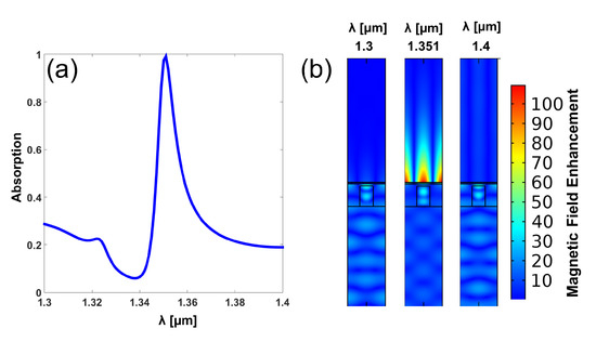 (a) Spectral absorption of the structure showing the resonance peak at m. (b) Magnetic field enhancement maps for several wavelengths (m).