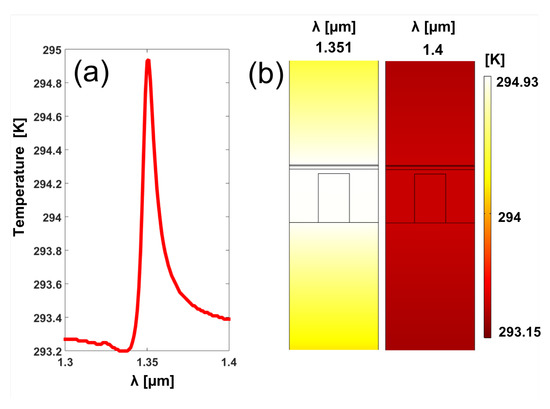 (a) Maximum temperature reached at the structure in terms of the wavelength. (b) Temperature distribution within the structure for the resonant (m) and non-resonant (m) wavelengths.