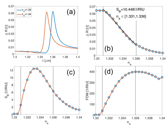 (a) Variation of the resistance of the structure as a function of wavelength. (b) Variation of the resistance with the index of refraction of the analyte when the structure is illuminated on resonance (m). The linear fitting in the interval defines a value of sensitivity, (where RIU means refractive index units). (b) Variation of the sensitivity, , as a function of the index of refraction of the analyte, . (d) Dependence of the FOM in terms of . The open circles in (b–d) denote the evaluated values, and the solid lines represent an interpolation of these dependences. The vertical dotted lines in (b–d) show the range in the index of refraction, , where the system is linear.