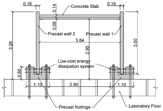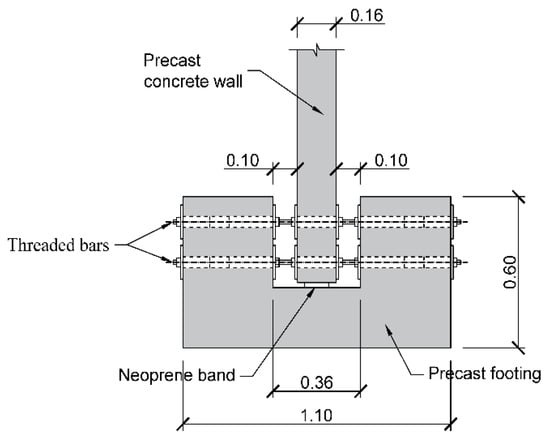 The structural wall is a conventional reinforced concrete precast element 3.0 m high, 2.0 m wide, and 16 cm thick. The wall is placed on a reinforced concrete precast footing, 1.1 m wide, 2.0 m deep, and 0.6 m high. In both cases, the concrete quality is C30/37, according to Eurocode 2 []. The compressive strength was obtained following the method described in standard EN 12390-3 []. The footing includes a longitudinal pocket 36 cm wide and 36 cm high, where the structural wall is placed. Underneath the wall, a 2 cm neoprene band is placed. The structural wall is rigidly connected to the footing through the low-cost energy dissipation system, which is described later (Figure 1).
