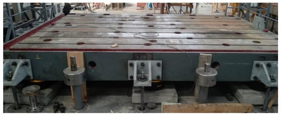 The shake table is composed of a cast steel slab 4.14 m long, 2.87 m wide, and 0.65 m high. It rests on six circular elastomeric bearing pads, reinforced with steel plates. The dimensions of the bearings are 350 mm diameter and 137 mm high.