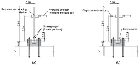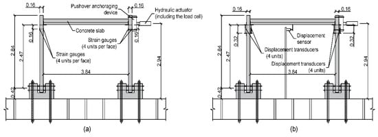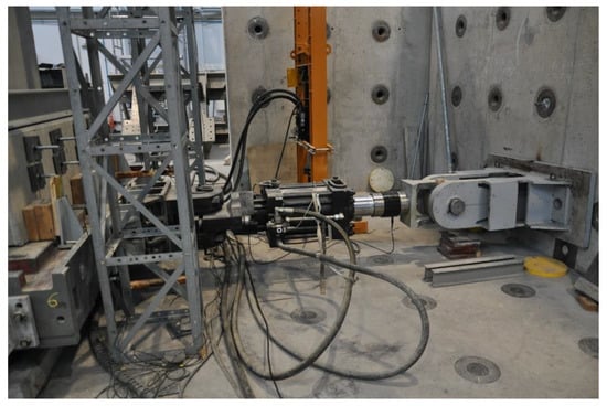 The tests on both the isolated structural walls and the structural frames were carried out using a tension-compression MTS 201.70F dynamic actuator (MTS, Eden Prairie, MN, USA), with a capacity of ±1000 kN. The actuator had a load cell MTS 661.31F-01 (MTS, Eden Prairie, MN, USA), with a range of ±1000 kN and an error of below 1% of the range. The tests were displacement controlled. This testing procedure provided greater safety against unexpected collapse and it better meet the requirement of the ACI 374.2R-13 [].