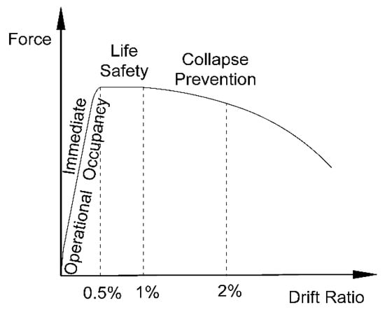The pushover tests carried out on the isolated structural walls and the structural frames were developed according to the American standard ACI374.2R-13 []. According to this standard, four levels of structural performance under seismic events are defined, which are “operational”, “immediate occupancy”, “life safety”, and “collapse prevention”, moving from least to greatest lateral drift ratio (Figure 7).