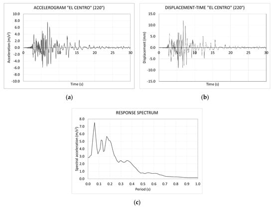 The third phase consists of seismic tests on a real-scale three-storey precast concrete building. In this case, a representative earthquake was reproduced in the laboratory, namely “El Centro” (an earthquake that occurred in the city of El Centro, California, USA in 1979). More specifically, the accelerogram belonging to an orientation of 220° was considered, because this was the most unfavourable in terms on maximum horizontal accelerations. The accelerogram was obtained from the USGS (United States Geological Survey, USA) (Figure 10a).