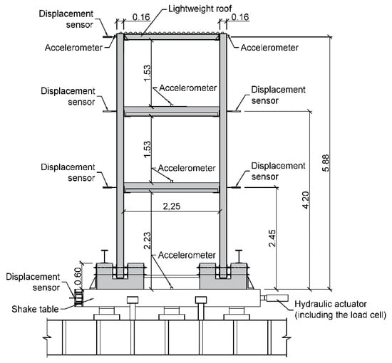 Finally, the real-scale three-storey precast concrete building is composed of two precast concrete walls, two precast footings, two concrete slabs, and a flexible steel roof. The inner distance between the two walls is 2.25 m. In all cases, the concrete quality is C30/37, according to Eurocode 2 [].