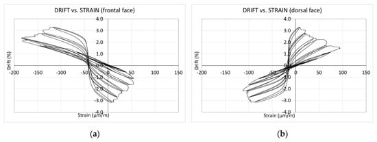 Figure 14 shows the relationship between the drift of the wall and the average vertical strain of the concrete at the base of the wall, at both the dorsal face (where the actuator is placed) and the frontal face (the opposite side). In this case, a positive value of strain denotes tension, and a negative value denotes compression.