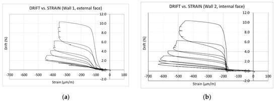 Figure 17 shows the relationship between the drift of the walls and the average vertical strain of the walls’ concrete, near but below the connection with the slab, at both the internal and the external faces. In this case, a positive value of strain denotes tension, and a negative value denotes compression.