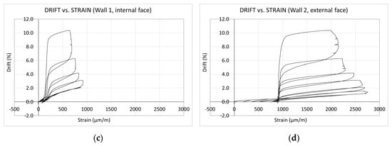 Diagrams of drift vs. vertical strain. Pushover test on structural frame. (a) Drift versus strain in the external face of wall 1; (b) drift versus strain in the internal face of wall 2; (c) drift versus strain in the internal face of wall 1; (d) drift versus strain in the external face of wall 2.