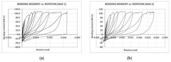 Diagrams of bending moment vs. rotation. Pushover test on structural frame. (a) Bending moment versus rotation of the connection between wall 1 and slab; (b) bending moment versus rotation of the connection between wall 2 and slab.