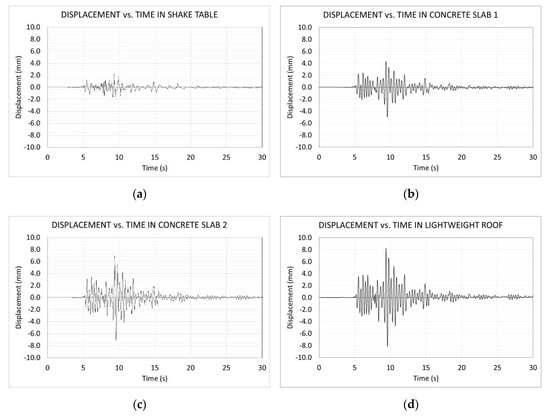 Figure 19 shows the diagrams of the longitudinal displacement versus time during the “El Centro” earthquake at the following locations: shake table, Concrete Slab 1, Concrete Slab 2 and lightweight roof.