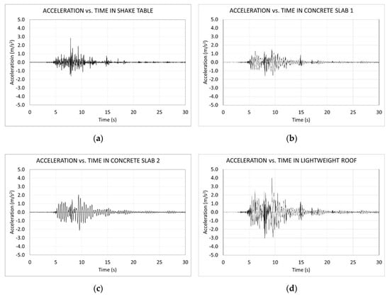 Diagrams of longitudinal acceleration vs. time at different locations, from shake table to lightweight roof. (a) Acceleration versus time in shake table; (b) acceleration versus time in concrete slab 1; (c) acceleration versus time in concrete slab 2; (d) acceleration versus time in lightweight roof.