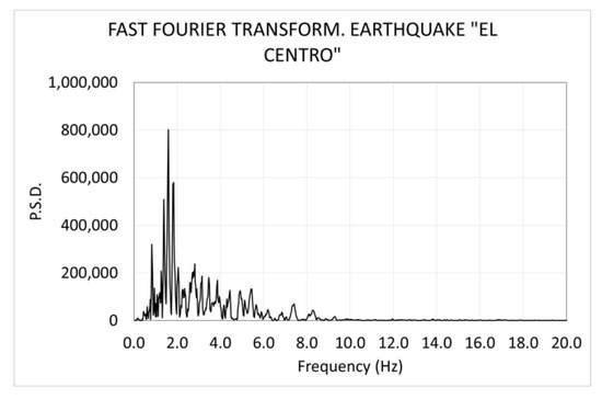 The dominant excitation frequency of the earthquake “El Centro” is around 1.6 Hz (Figure 21), and the natural frequency of the building is around 3.4 Hz before the seismic tests (Figure 22) and 2.6 Hz after them (Figure 23). This large difference between the excitation frequency and the natural frequency implies that the longitudinal accelerations that the earthquake causes in the building are small. Consequently, the horizontal inertial forces are also small, as well as the internal forces caused by the earthquake.