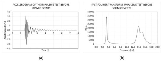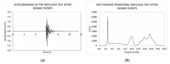 One-cycle impulsive test after seismic events. (a) Accelerogram; (b) fast Fourier transform.