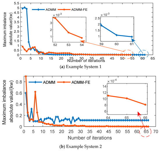 Taking the iterative process of obtaining the initial point as an example, the convergence of the ADMM-FE algorithm and the directly generalized ADMM algorithm is compared and analyzed. According to the algorithm parameter settings, under the constraints of a = 0.001 and b = 0.0001, the maximum imbalance amount εk in the optimization process is shown in Figure 2. The ratio of the target difference between the two iterations is shown in Figure 3.