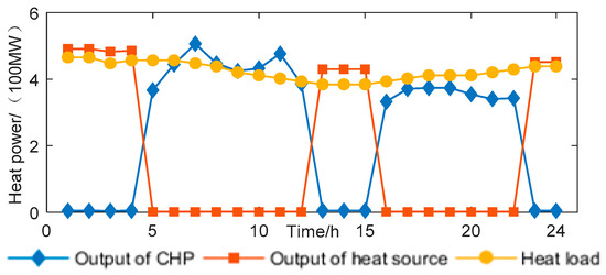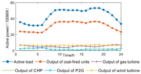 It can be seen from Figure 4 that in the power network, in the early morning hours, the power load is low, and the wind turbine output is high. At this time, the power of the P2G device can convert the wind power into natural gas storage to absorb the wind power. After 7 o’clock, the daytime work starts, the electric load increases, the grid can absorb all the wind power, so the power of the P2G device drops to 0. In the evening, the power load reaches a peak, and the output of the coal-fired unit reaches the upper limit. At this time, the gas turbine output with higher output cost is called to maintain the power balance. At other times, the coal-fired unit’s own output can meet the load demand, so the gas turbine output has been maintained at the lowest level. Therefore, the gas turbine output will maintain the lowest value during the period except for fluctuations from 17 to 19 h. The electrical output of the CHP device is determined by the thermal output. Therefore, in addition to the CHP heating for the demand of heating networks during 6~12 h and 16~22 h, the CHP output grid power is zero.