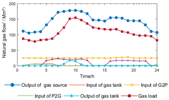 It can be seen from Figure 5 that in the gas network, in the early morning hours, the gas load and the gas consumption of the gas turbine are low, and the grid inputs high natural gas for the wind power converted by P2G, so the gas tank input is high with 0 output, and the surplus natural gas is stored in the gas storage tank used as a slow storage energy. During the daytime working hours, as the air load increases and the heating-network-demand CHP increases, the gas tank input decreases and the output increases. At 9 h, the gas load peaks and the gas tank output peaks.