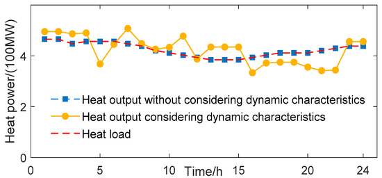 As shown in Figure 7, under the condition of neglecting the dynamic characteristics of the heating network, the CHP output and the external heat source output are constrained by the heat load, and the output and load are coincident. After considering the dynamic characteristics of the heating network, the CHP output and the heat source output are no longer subject to the heat load. During 5~6 h, 16~22 h, the heat load is higher than the heat output, and the heat load is satisfied by CHP, external heat source and heat storage. In the rest of the time, the heat output is higher than the heat load, so the excess heat energy is stored in the heat network as the heat storage energy.
