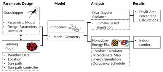 In this research, the workflow involves an output model in Rhinoceros that is linked to the parametric design and simulation tools, as seen in Figure 3. The parametric Grasshopper algorithms control the output model by changing the values of parameters through floating sliders and functional components that are linked to the model. Ladybug utilizes weather data as weather files that can be imported into the Grasshopper scripting environment to create sun paths that are linked to the output geometry. The output geometry is then analyzed through a combination of climate-based simulation tools, in this case, Diva Daysim and Energy simulation tools, such as Honeybee.