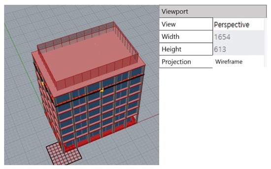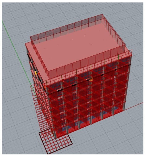 In this research, the algorithm was used to generate the test building model, which is a seven-floor building with a width and length of 16.54 by 6.33 m, which are in centimeters in the Rhino modeling platform. Figure 5 presents the generated model is a perspective view.