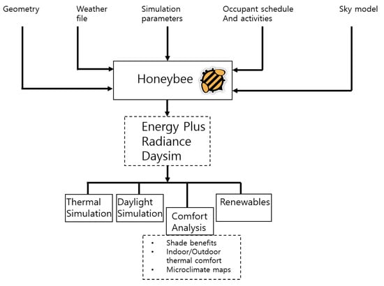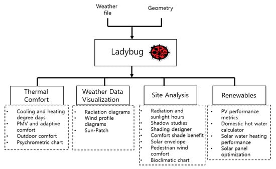 - Roudsari, M.S.; Pak, M. Ladybug: A parametric environmental plugin for grasshopper to help designers create an environmentally-conscious design. In Proceedings of the BS 2013: 13th Conference of the International Building Performance Simulation Association, Chambéry, France, 25–28 August 2013; pp. 3128–3135. [Google Scholar]