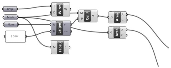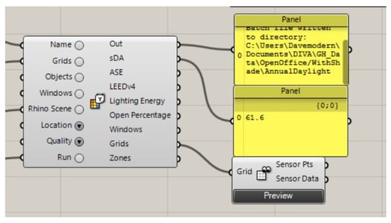 The intensity with which a surface is illuminated and part of the SI system of measurement. One lux is equal to one lumen per square meter. Figure 10 illustrates the algorithm script to measure the lux area in Rhino Grasshopper for analysis of areas that are below a 1000-lux threshold and indoor comfort of occupants throughout the year. To simulate the lux area, the model can be converted to a mesh and connected to a selected floor of the Rhino model through the Grasshopper script.