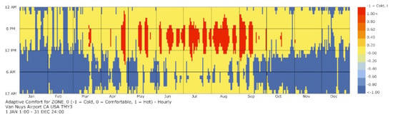 The indoor comfort of occupants’ deals with metrics of temperature concerning daylighting and the activities of the building occupants also consider factors, such as metabolic rate. The script for indoor comfort uses a micro-climate simulation and the energy model is built with Honeybee components as the results of EnergyPlus being incorporated into the script as a Honeybee component. Honeybee can perform many simulation tasks that are offered by EnergyPlus, Radiance, and Daysim. The central premise of Honeybee is to facilitate data entry, simulation execution, and visualization of results all in one place. Simulations of the geometric model in this research utilize honeybee’s algorithm for comfort analysis through a combination of microclimate maps shade benefits for the indoor comfort of the occupants, as seen in Figure 11.