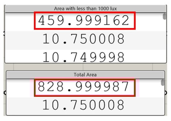 The outdoor light level is approximately 10,000 lux on a clear day. In the building, in the area closest to windows, the light level might be reduced to approximately 1000 lux [23]. In the middle area, it might be as low as 25–50 lux. Additional lighting is often necessary to compensate for the low levels. In this paper, we simulated the lighting of the building against 1000 lux as recommendations of the recent light level based on indoor activities are more common in the range 500–1000 lux, depending on activity. The simulation results show the areas with less than 1000 lux at approximately 50% percent of the total area of 829 m, as seen in Figure 13. Other areas will maintain Lux levels lower than 1000 lux, where additional artificial lighting might be needed. The model maintaining a steady rate of 50% is due to the interactive facade placed on one side of the building, rather than the entire building.