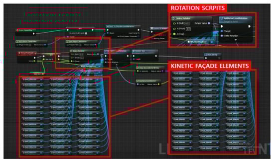 The motion animation of the louver facade elements in the virtual environment is controlled by blueprint visual language programming. The entire model from Rhino and Grasshopper is imported into a virtual editor. All of the elements of the model are set to a static motion setting, except for movable facade elements that are set to a movable setting. Additionally, aspects of the virtual environment that will require change over time, such as sun position and sky sphere, are set to movable.