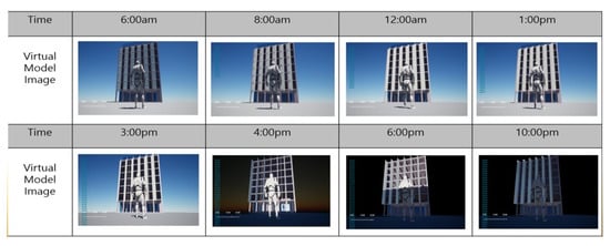 This animation blueprint can serve as a template for similar models that require motion animation with a replacement of the animations scripts and elements in the virtual environment and changes to the speed, angle, and direction of rotation, as desired by the user. The virtual reality model interface reflects the motion of the parametric design in a photo-realistic platform with the required environment for testing, which could only be realized in the model testing phase of existing process. The virtual reality model reflects the configuration of the building at various times of the day and iterations can be made to the generated parametric model based on the virtual analysis. The virtual model can be analyzed at different times of the day, as seen in Figure 16, with changes to the daylight in the virtual environment.