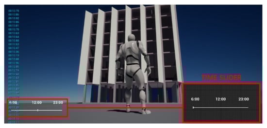 The geographical sun position and connection to an interactive facade system are controlled through a widget interface based on time of the day. Furthermore, the customization of the motion in terms of direction, type of mechanical motion, and speed and virtual environment are controlled through an interactive User Interface (UI). The widget UI binds to the animation blueprint and in this case, we utilized a time slider UI to control the entire virtual environment. The time slider controls the rotation of movable elements concerning sun position that reflects the time, as seen in Figure 17. Additionally, through a print screen script, the accurate time in hours, minutes, and seconds are printed on the screen.