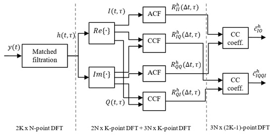 For each TVIR, mean values of these coefficients can be obtained as: and . The calculation of these coefficients requires the calculation of the TVIR estimate first. As mentioned in Section 2, the DFT transform is usually used to implement the matched filtering algorithm. As it is shown in Figure 1, to calculate K realisations of , each of which has N samples, the N-point DFT algorithm should be run times.To be more precise, one DFT is used for frequency domain transition, and one inverse DFT is needed to return to the time domain. Next, the autocorrelation functions (ACFs): and , and cross-correlation functions (CCFs): and are also calculated using DFT. There are calls of K-point DFT in the case of calculation of ACFs, and calls of DFT of the same size in the case of calculation of CCFs. The difference is due to the fact that in the case of ACF, the DFT is calculated for one input vector, and in the case of CCF, it is calculated for two different input vectors. In order to determine the correlation coefficients, DFT calls are needed, each of the size , resulting from the size of input ACFs and CCFs. In the case of calculating the and coefficients directly from the complex envelope of the received signal, the matched filtering step is omitted and there is of N-point DFTs less to calculate.