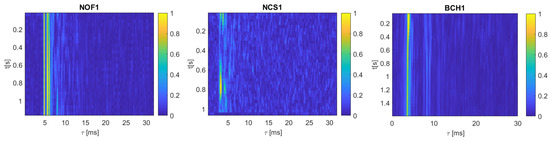 The simulation tests were performed using the Watermark simulator. It is a freely available benchmark for physical-layer schemes for underwater acoustic communications [18]. Its core is a replay channel simulator driven by at-sea measurements of the time-varying impulse response. Three of the communication channels available in Watermark were selected, represented by impulse responses measured in: Norway-Oslofjord (NOF1), Norway-Continental Shelf (NCS1), and Brest Commercial Harbor (BCH1). The NOF1 channel was measured at a range of 750 m and the water depth was 10 m. The probe signal frequency band was 10–18 kHz. The NCS1 channel was measured at a range of 540 m and the water depth was 80 m. The probe signal frequency band was the same as in the case of NOF1 channel measurements. Finally, the BCH1 channel was measured at a range of 800 m, where the water depth was 20 m. The frequency band of the probe signal was 32.5–37.5 kHz. The transmitter was bottom-mounted in the case of NOF1 and NCS1, and suspended in the water column in BCH1. The receiver was a bottom-mounted hydrophone (NOF1, NCS1) or a vertically suspended hydrophone array (BCH1). A more detailed description of Watermark channels can be found in [18]. Figure 2 shows the absolute values of exemplary impulse responses for each channel.